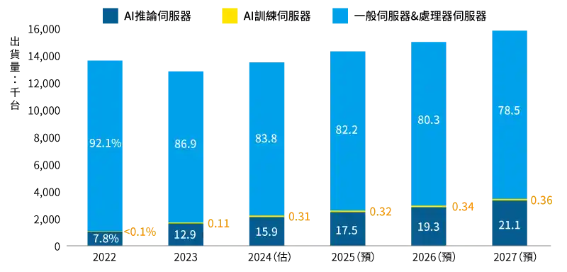 2024年全球AI伺服器出貨量與出貨占比遽增